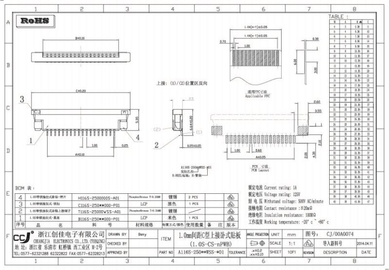1.0mm間距帶鎖臥貼上接抽屜式FPC