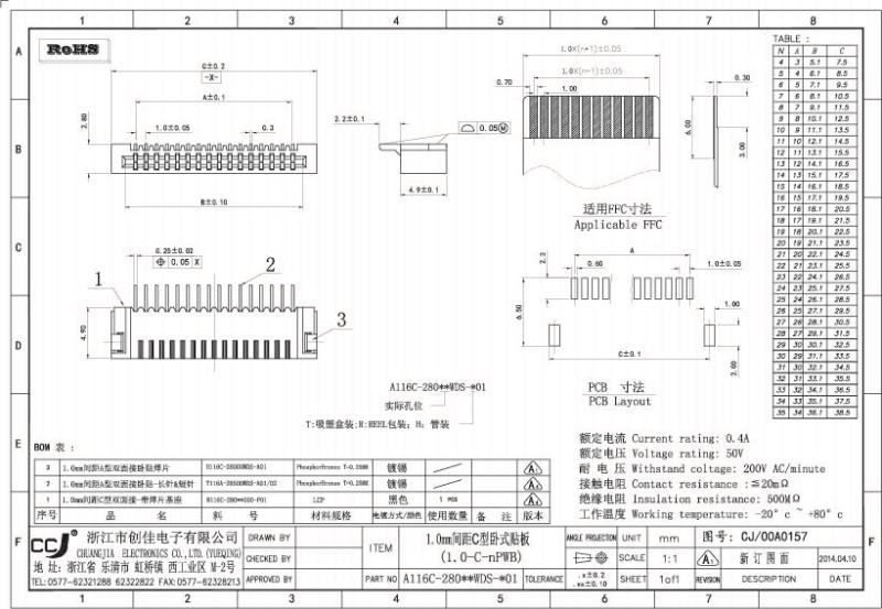 1.0mm間距帶鎖臥貼上接抽屜式FPC